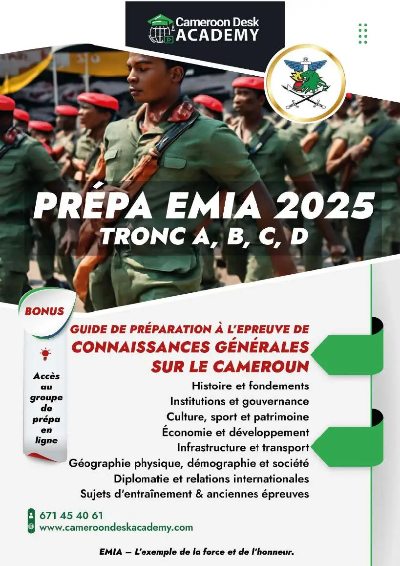 Tu cherches à te préparer au concours de l’Ecole Militaire Interarmées (EMIA) ? Alors tu es au bon endroit. Sur cette page, tu trouvera tous les documents nécéssaires pour t’aider dans ce sens. Guide de préparation aux visites médicales sommaires, Connaissances générales sur le Cameroun, Culture générale, mathématique, Langue anglaise, vous trouverez tous ici.